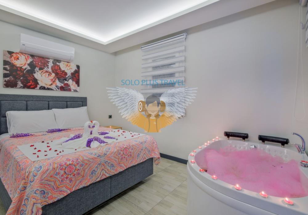 • Schlafzimmer 1: Doppelbett, Jacuzzi, Klimaanlage, Nachttisch, Kleiderschrank, eigenes Bad, dekoratives Fantasiefenster.