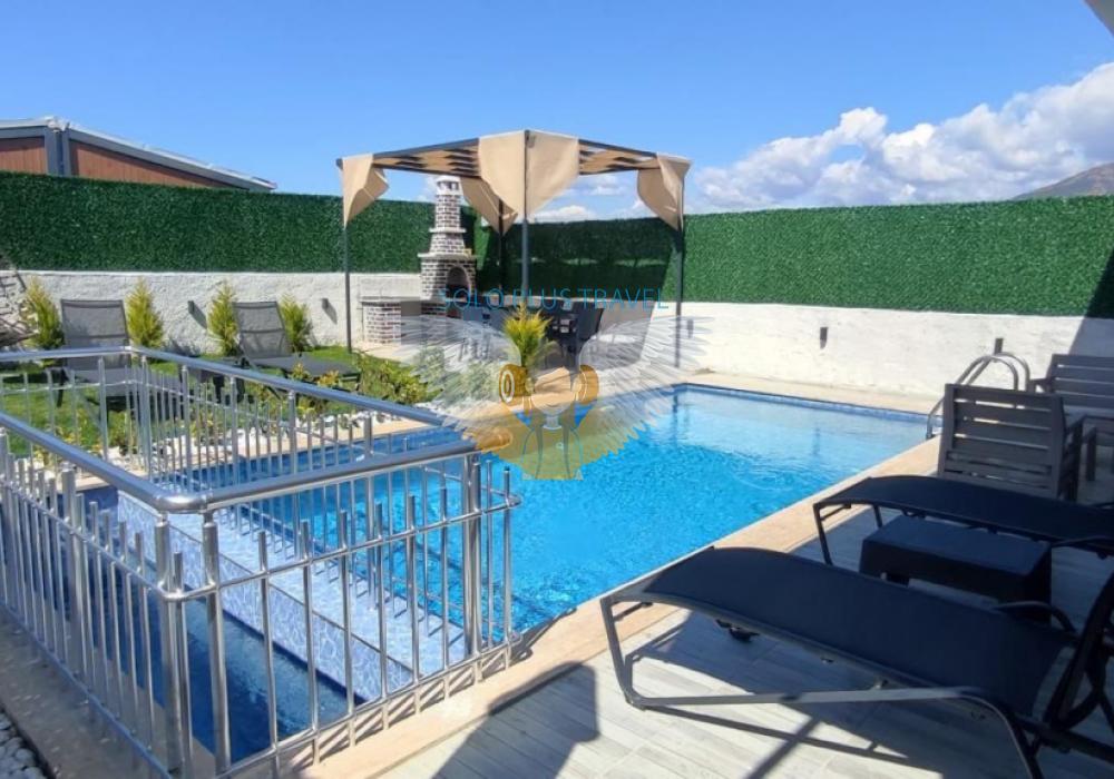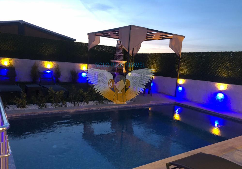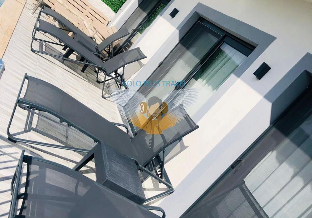 La amplia terraza de la piscina cuenta con tumbonas, zona de estar, columpio y área de barbacoa. El salón cómodo se abre directamente a la terraza de la piscina y la cocina abierta totalmente equipada ofrece una experiencia de vacaciones agradable.