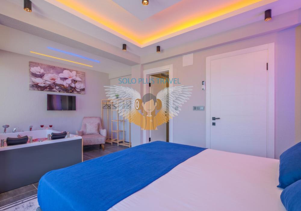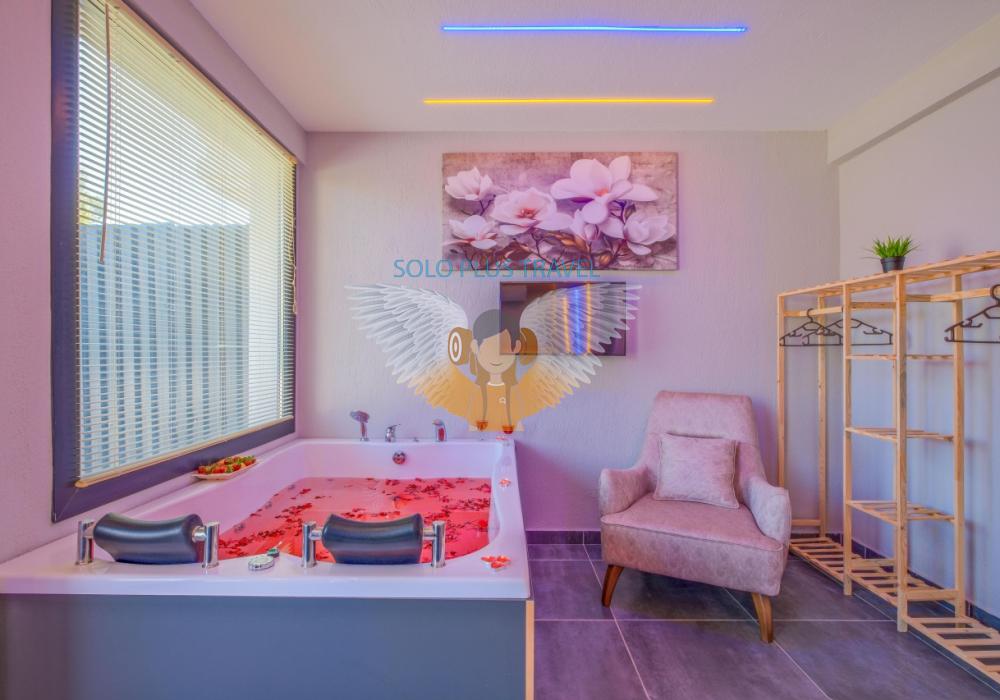 La première chambre comprend un lit double, une salle de bain privative et un jacuzzi ; la deuxième chambre dispose de deux lits simples et d’une salle de bain.
