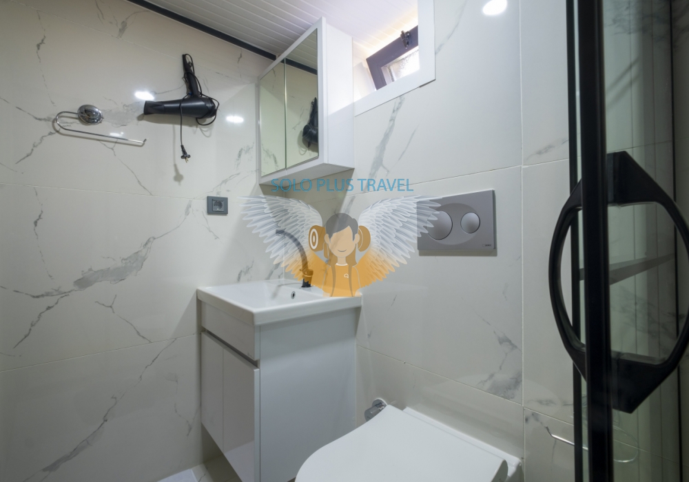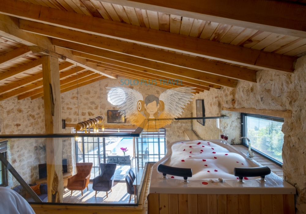 Спальня 1: Двуспальная кровать, шкаф для одежды, джакузи, тумбочка.