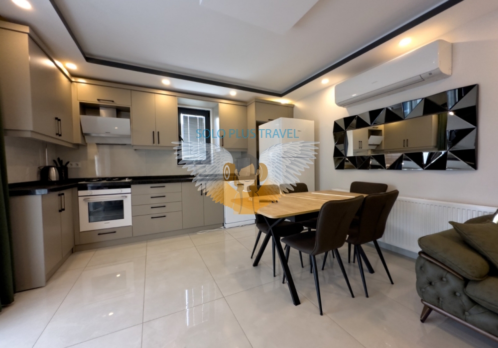 Mutfak Amerikan mutfak tarzı; ankastre fırın, bulaşık makinesi, buzdolabı ve gereçlerle tam donanımlı