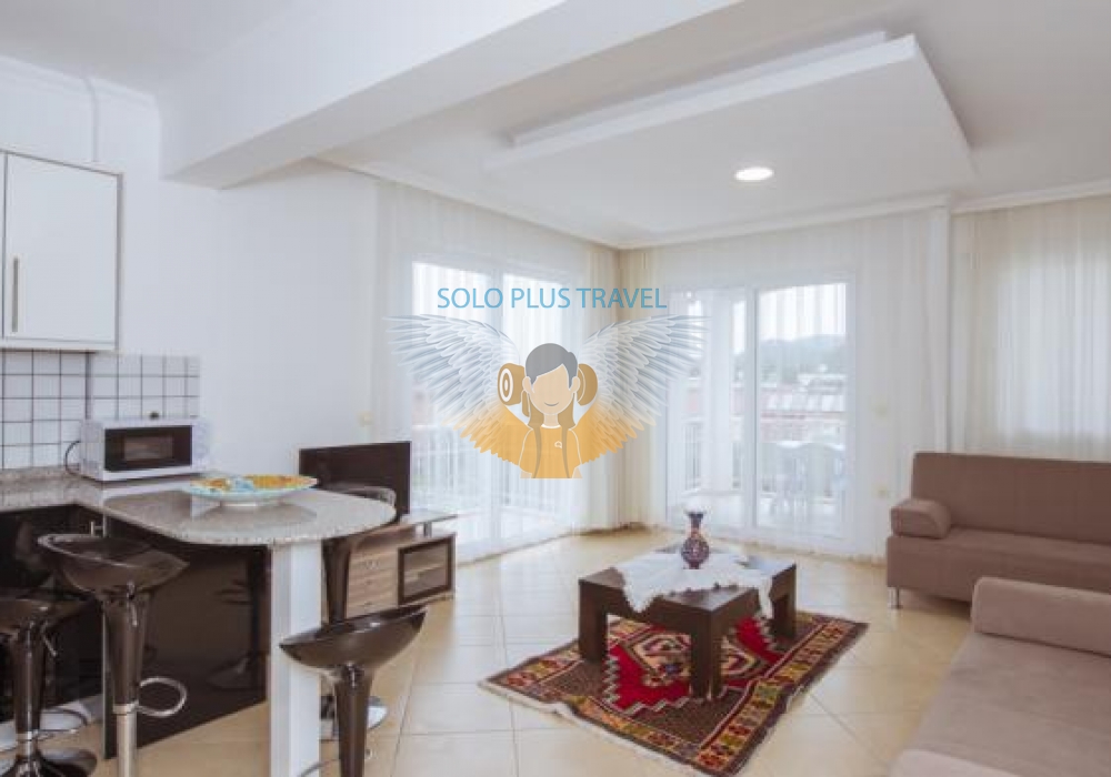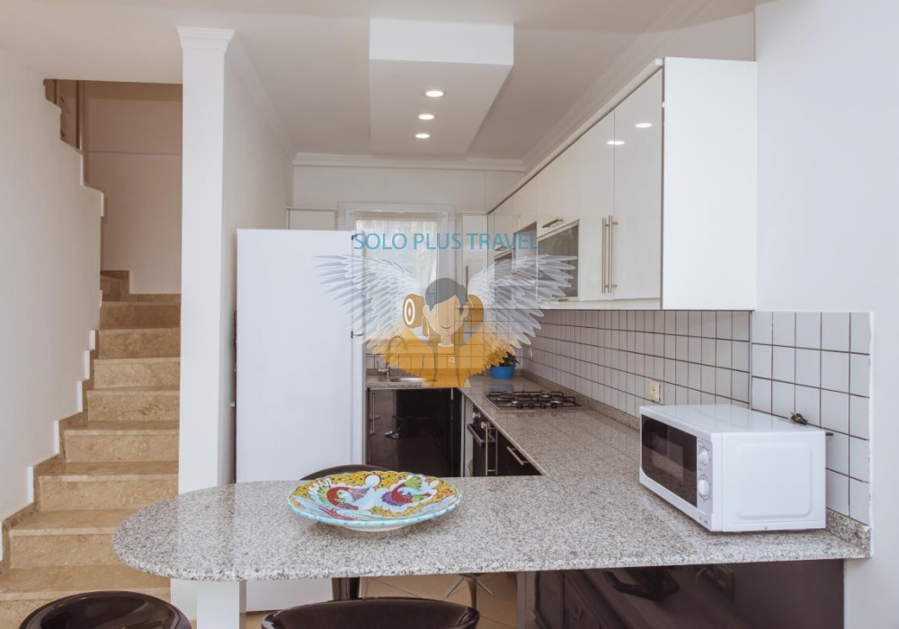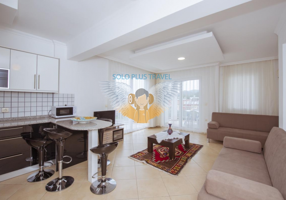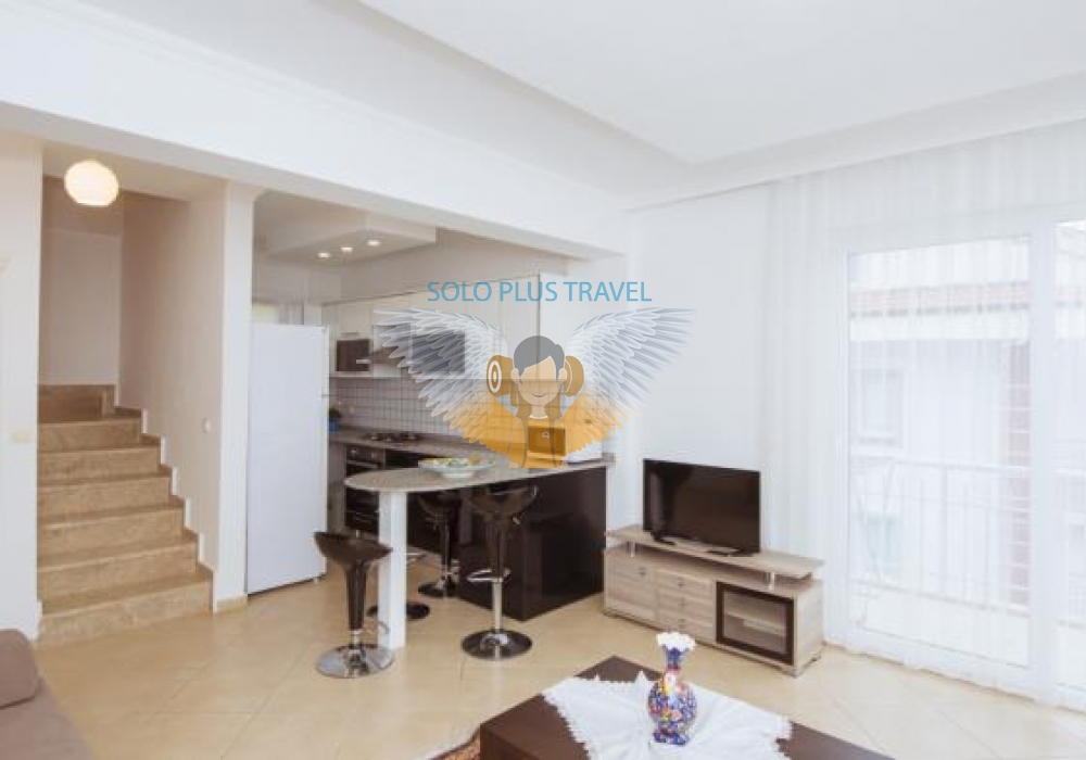 İç kullanım alanı  75 m2, 2+1 olan dairemiz  dublekstir. İlk Giriş katta açık planlı mutfağı ile modern yatak olabilen lüks koltuk takımı mevcuttur. Zemin Çift Kişilik Yatak Odası  &  2 Adet Tek Kişilik Yatak Olan Twin Odası ve 1 Banyo & WC mevcuttur.