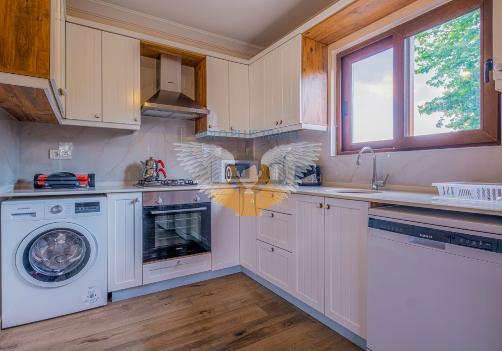 Açık mutfak planlıdır ve bir salonu (oturma odası) bulunmaktadır. Salonunda şömine, TV, oturma grupları ve yemek masası bulunmaktadır.