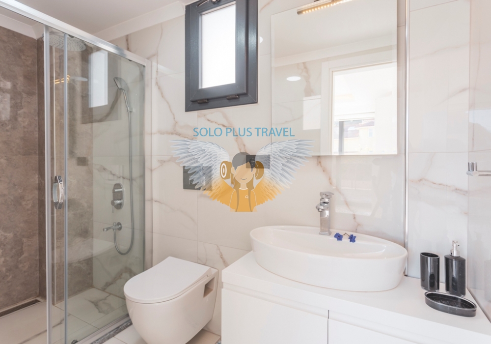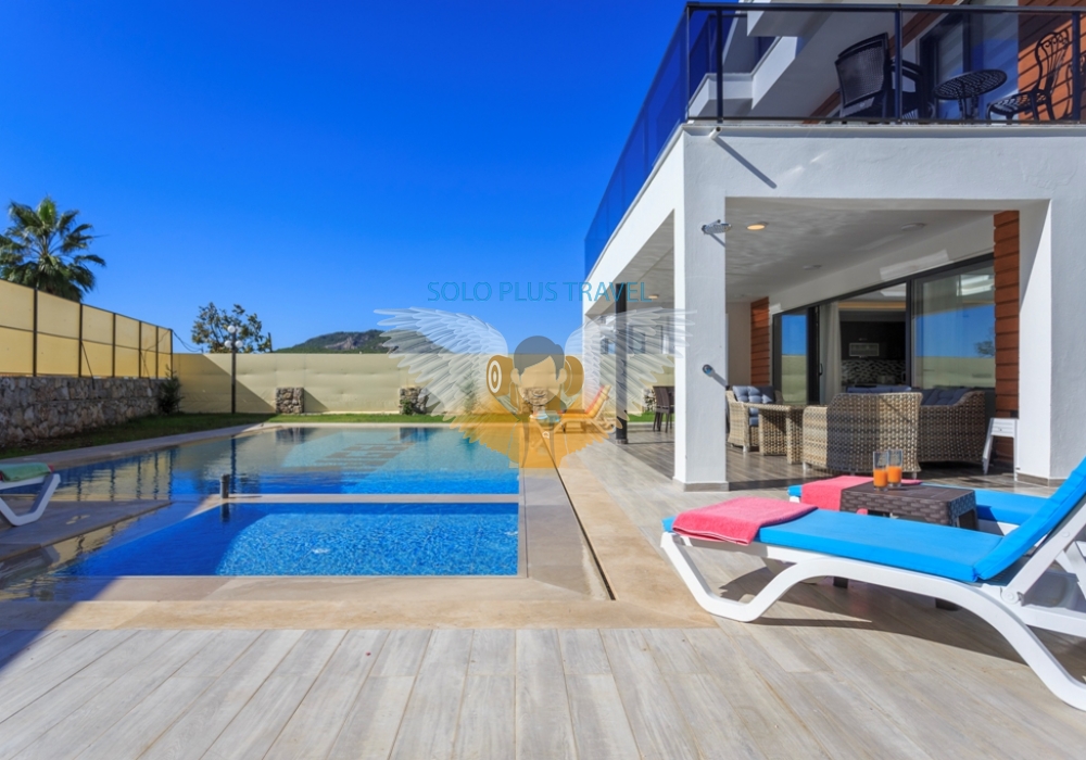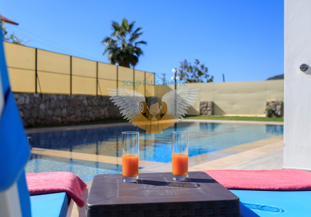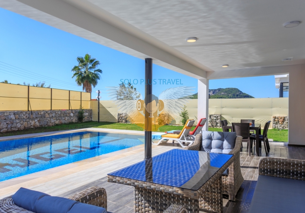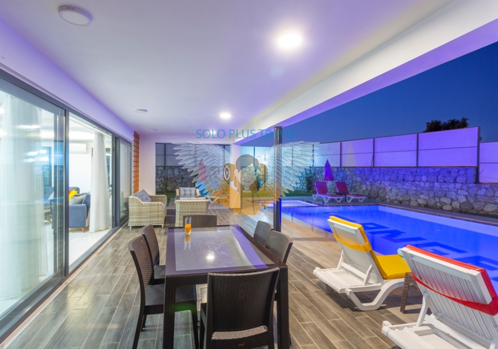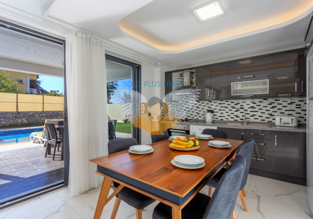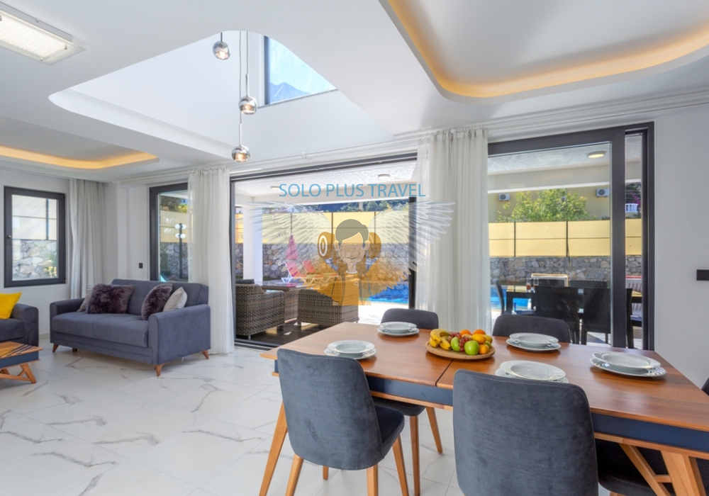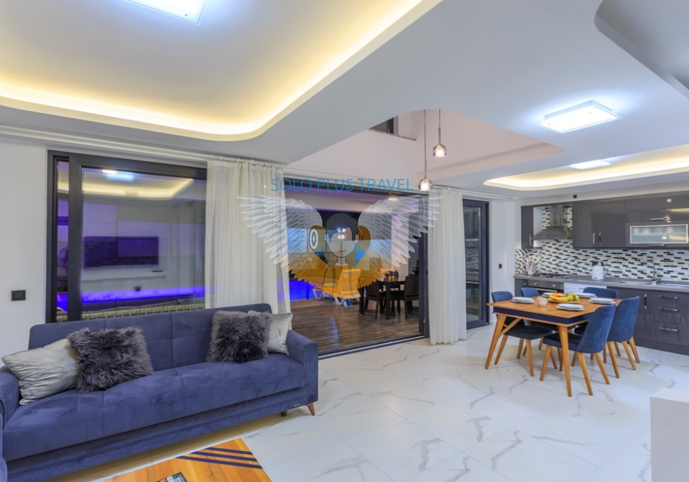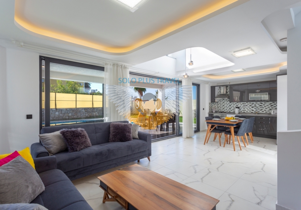 Salon:  Oturma grubu, WC, uydu alıcı, LCDTV,internet klima, yemek masası,sandalyeler ve havuza çıkış bulunmaktadır.