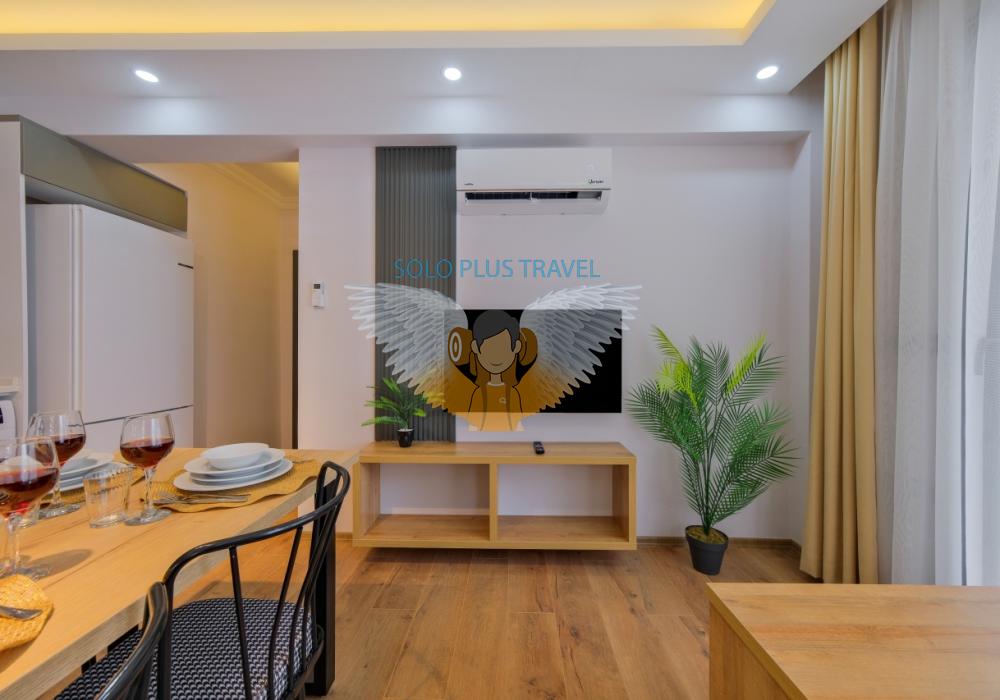 Daire içi tasarım sade, ferah ve kullanışlıdır. Geniş ve aydınlık oturma alanı; klima, TV ve konforlu oturma grubu ile donatılmıştır. Açık mutfak bölümünde buzdolabı, ocak, mutfak ekipmanları ve yemek takımları yer alır. Bu sayede misafirler ev konforunda yemek hazırlayabilir ve keyifli vakit geçirebilir.