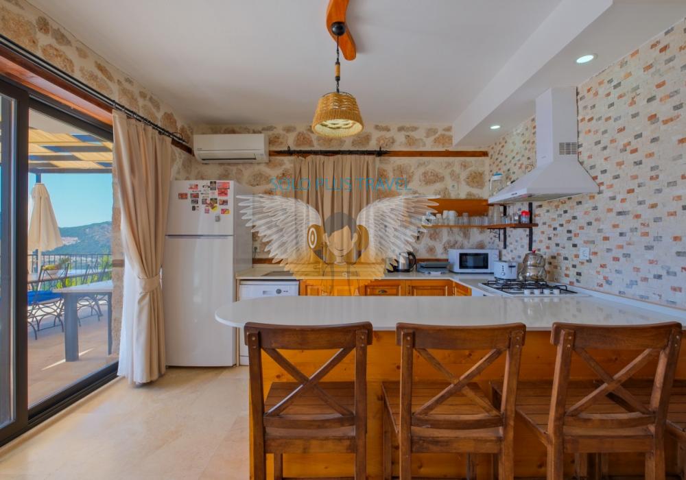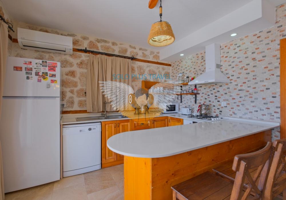 • Salon ve Mutfak: Geniş ve ferah bir salon, tam donanımlı Amerikan mutfak, klima, TV ve Wi-Fi gibi olanaklarla tatilinizi konforlu hale getiriyor.