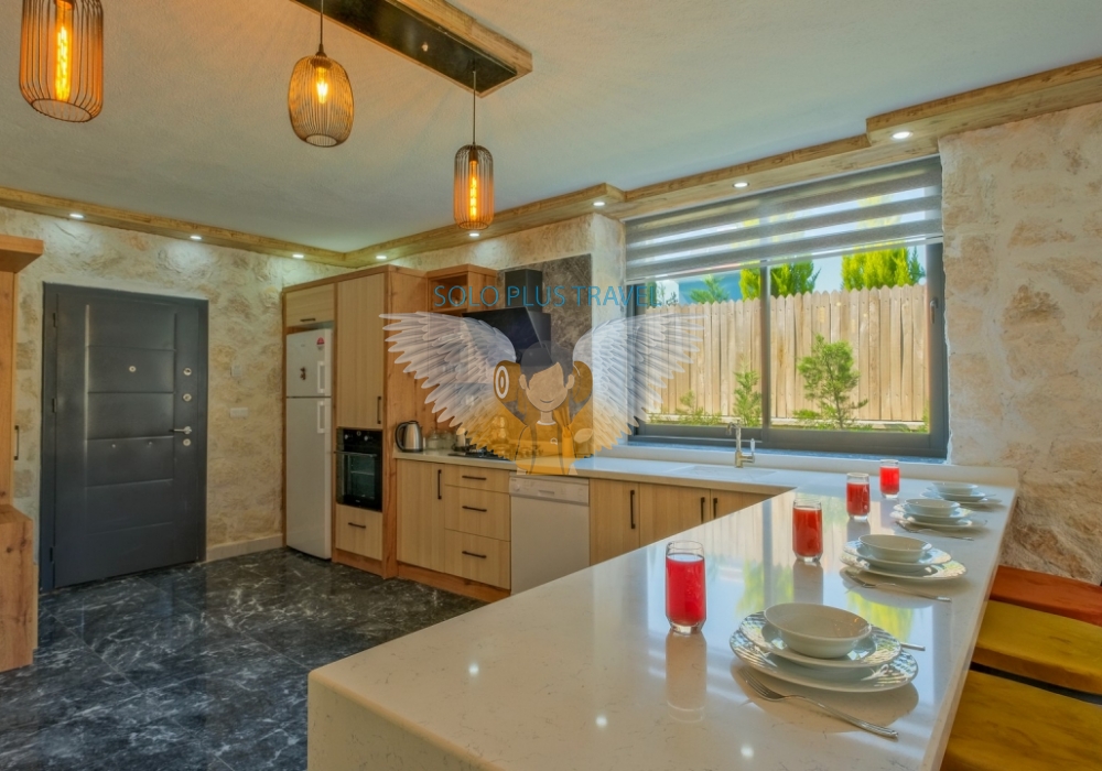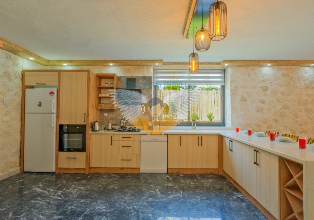 Villanın 1. yatak odasında çift kişilik yatak, klima, elbise dolabı, komodin, makyaj masası, jakuzi, banyo ve tuvalet gibi olanaklar mevcut. 2. yatak odasında ise iki tek kişilik yatak, klima ve kendi banyosu ile konfor korunuyor. Salon kısmında doğayla iç içe manzara eşliğinde dinleneceğiniz koltuk takımı, TV ünitesi ve uydu alıcısı gibi konfor öğeleri yer alıyor. Amerikan mutfağı ise ankastre ocak-fırın, mikrodalga, bulaşık makinesi gibi modern donanımlarla donatılmış; yemek hazırlamak ya da vakit geçirmek için eksiksiz.